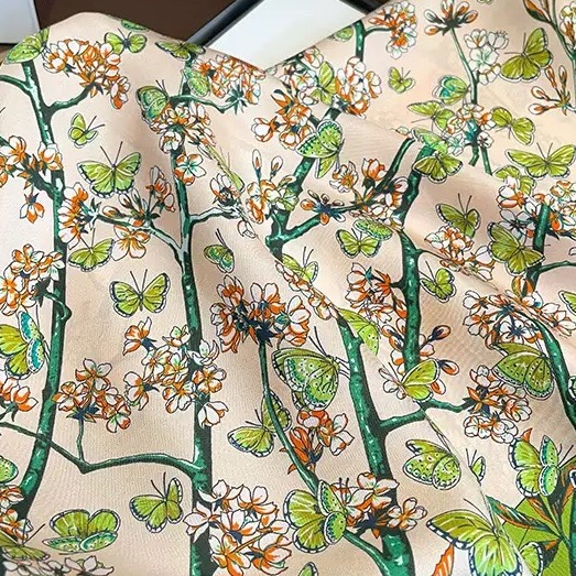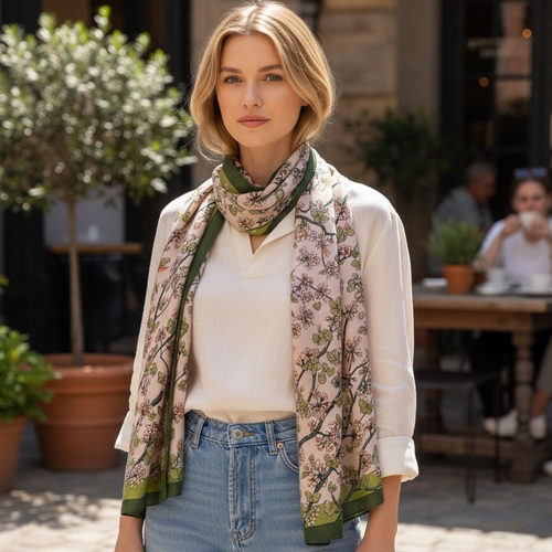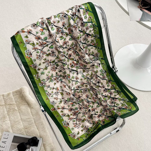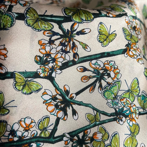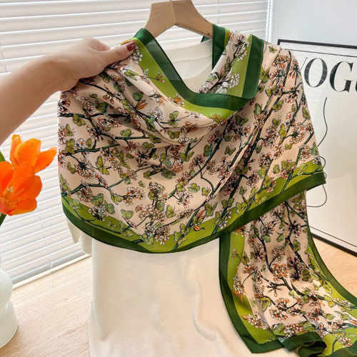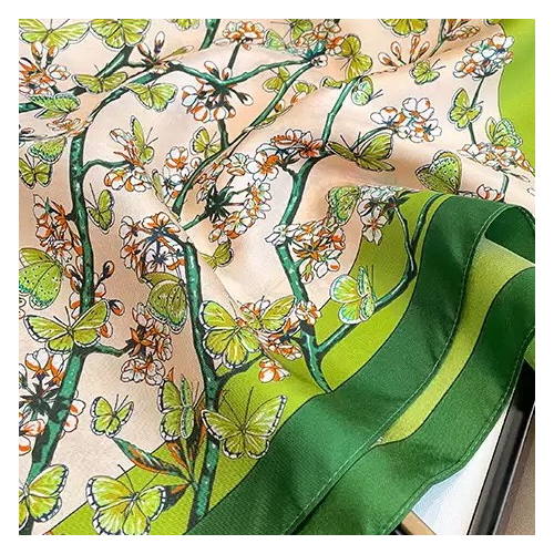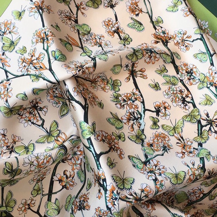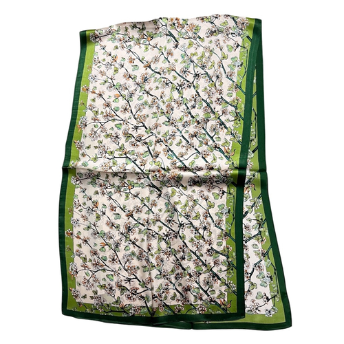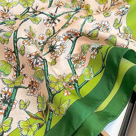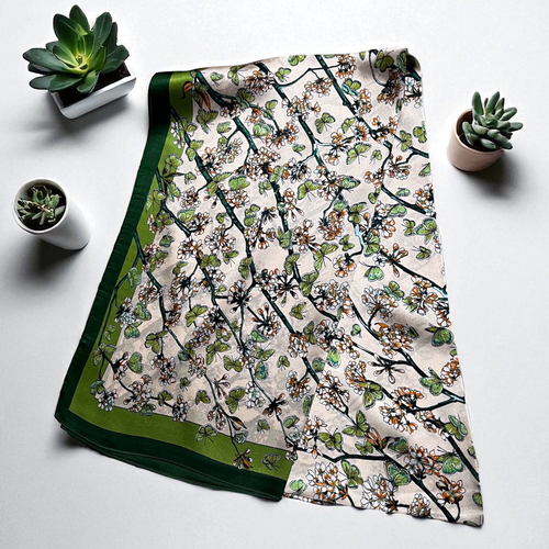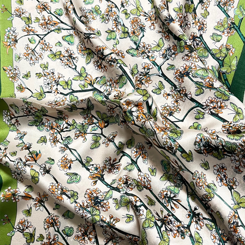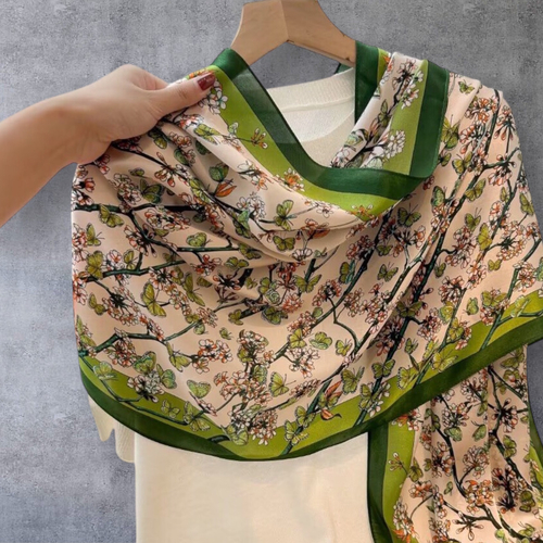 Oferă un cadou de neuitat cu această eșarfă din mătase naturală, un accesoriu de lux ce îmbină eleganța cu originalitatea. Realizată din 100% mătase fină, eșarfa impresionează prin designul său vintage, cu fluturași, în nuanțe contrastante de bej și verde.