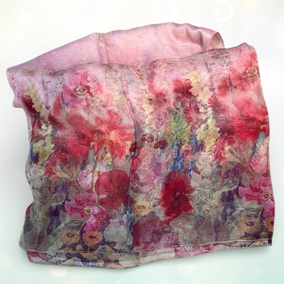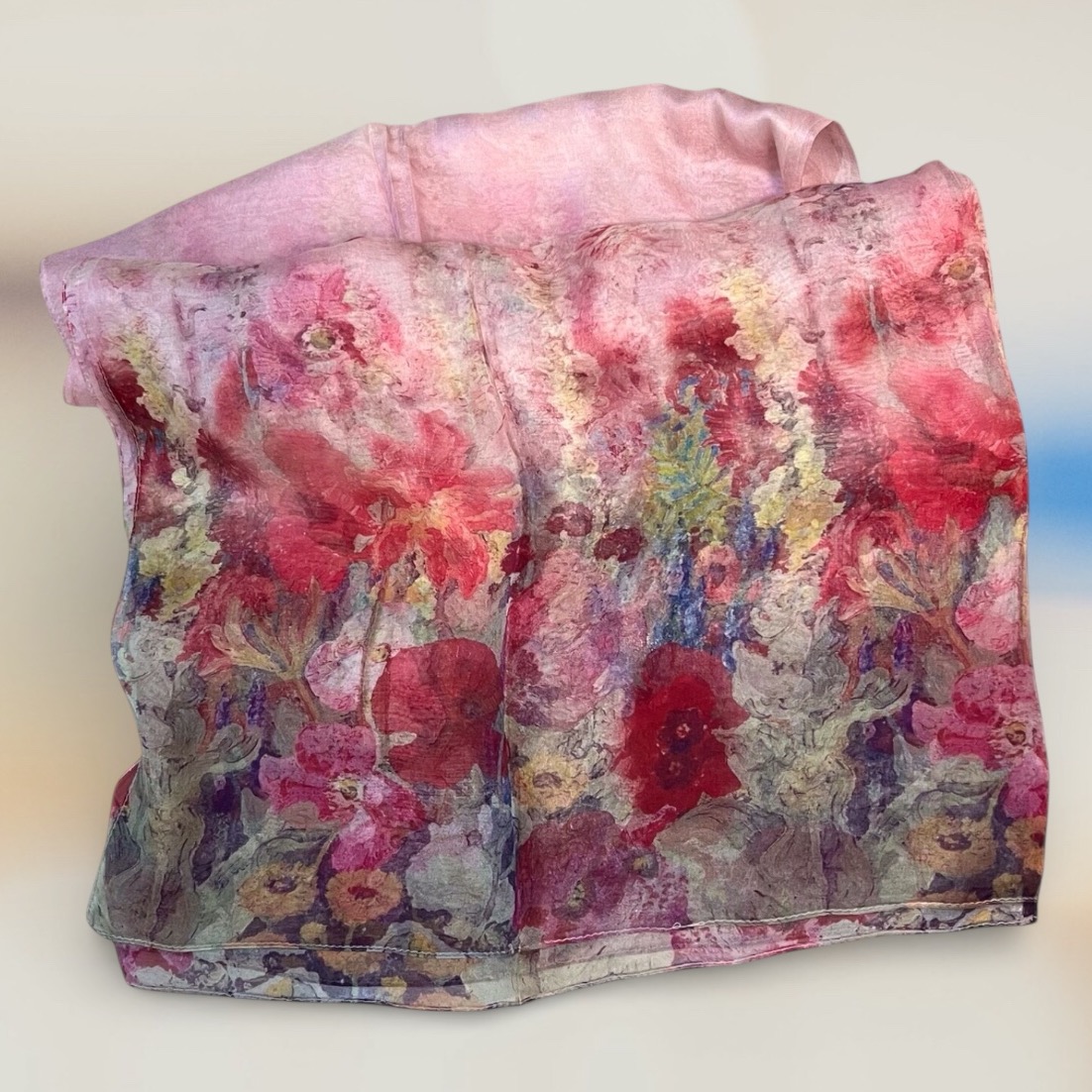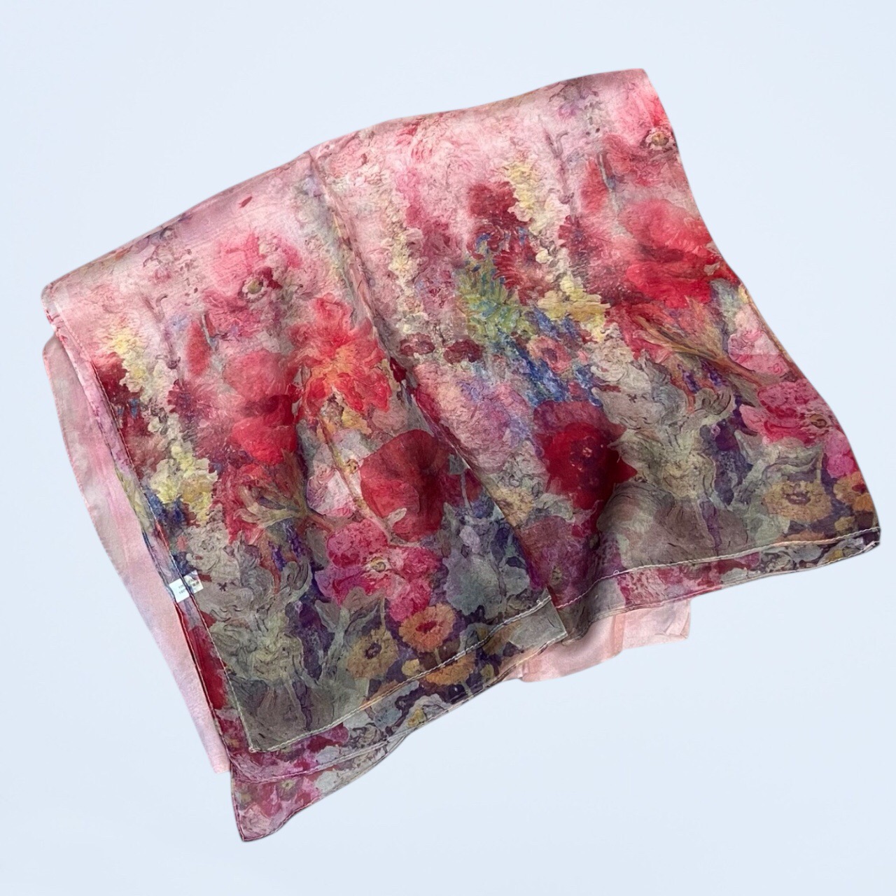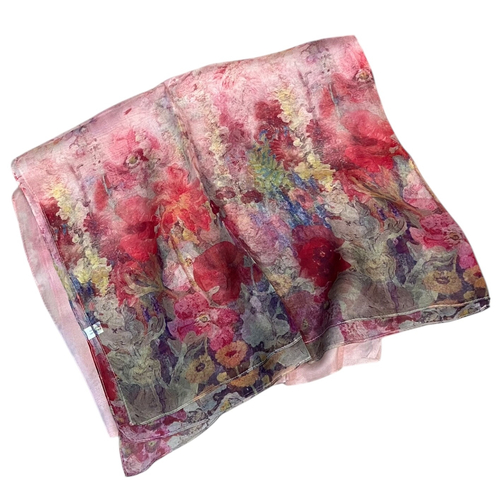 Realizată din mătase ultra fină, ușoară și delicată la atingere, eșarfa impresionează prin tabloul