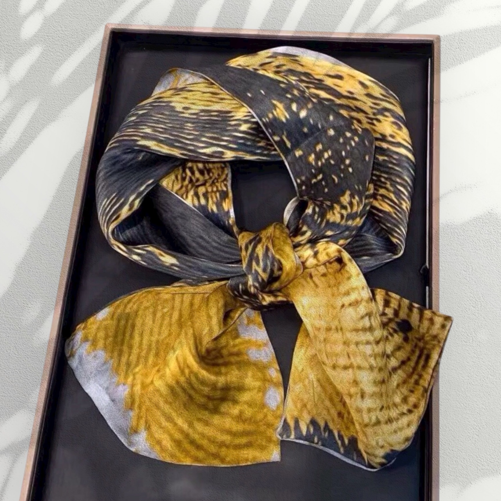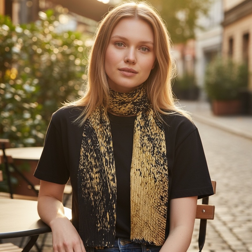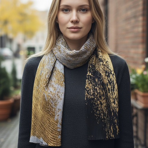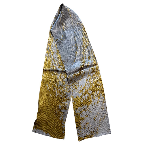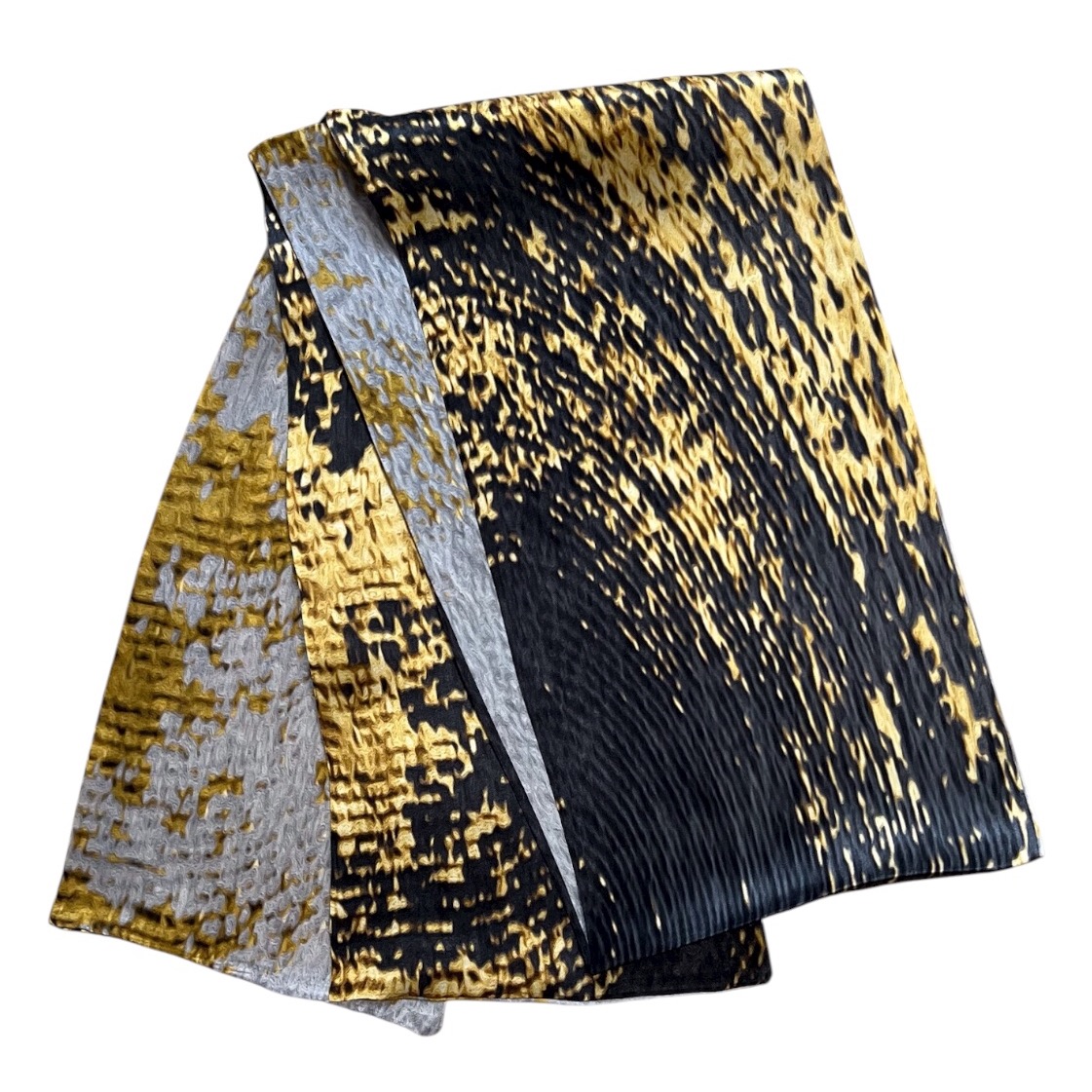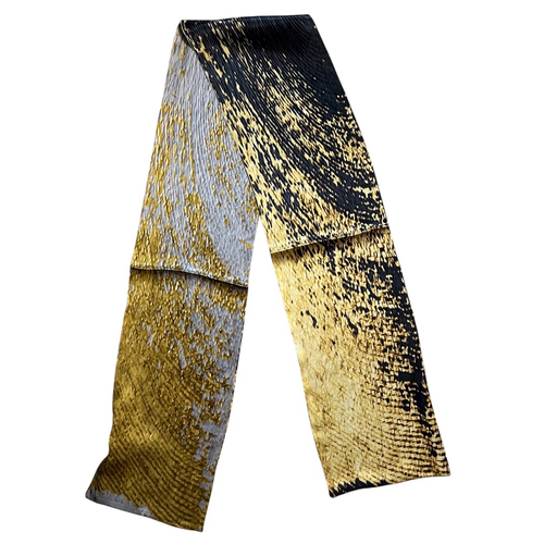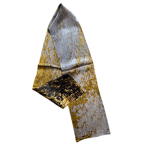 Esarfa Luxury cu doua fete,din matase naturala cu design original,pictata in culori vii,negru cu auriu si argintiu cu auriu,ce ofera un contrast vizual deosebit.