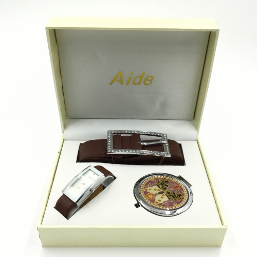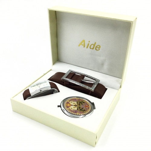 Setul contine o oglinda pentru poseta,din metal,un ceas de mana si o curea.