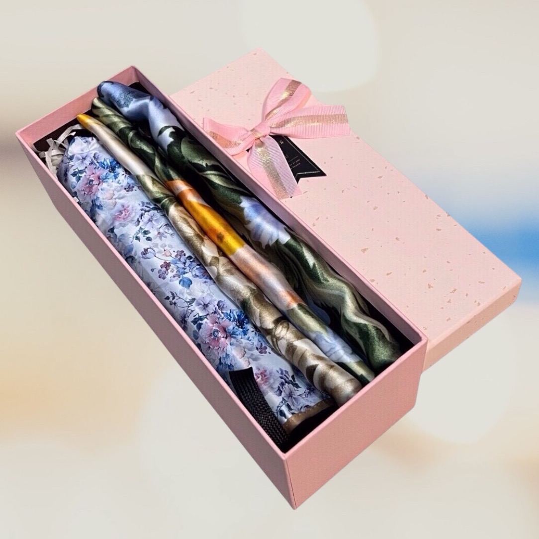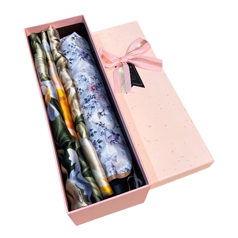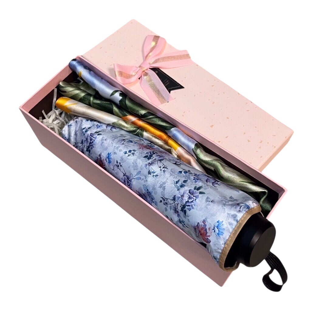 Setul conține o umbrelă pliabilă cu design floral delicat și o eșarfă fină din mătase naturală, ambalate într-o cutie premium de prezentare cu fundă decorativă, gata de oferit cadou.