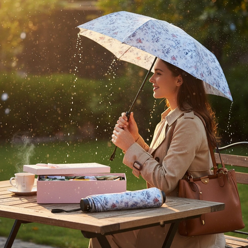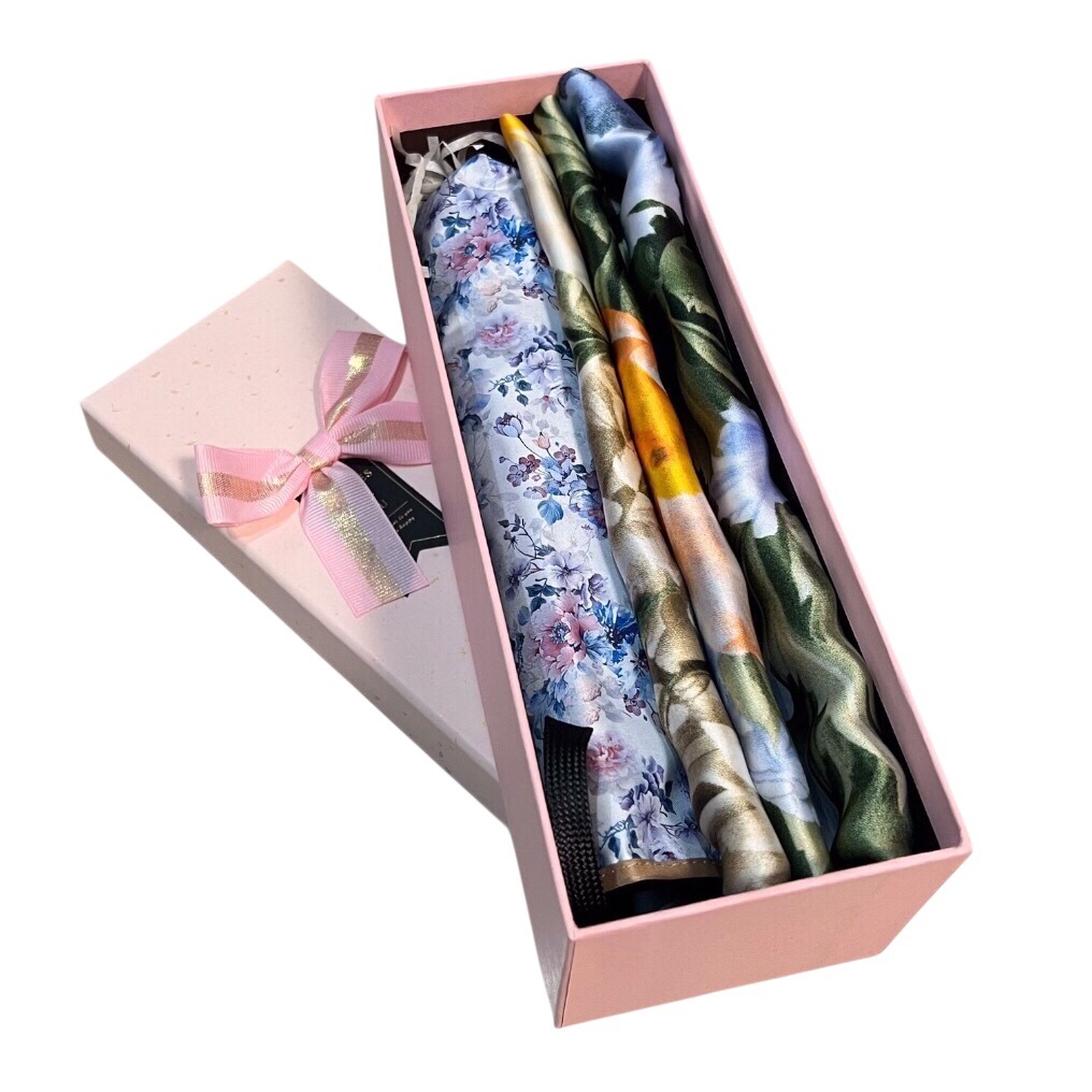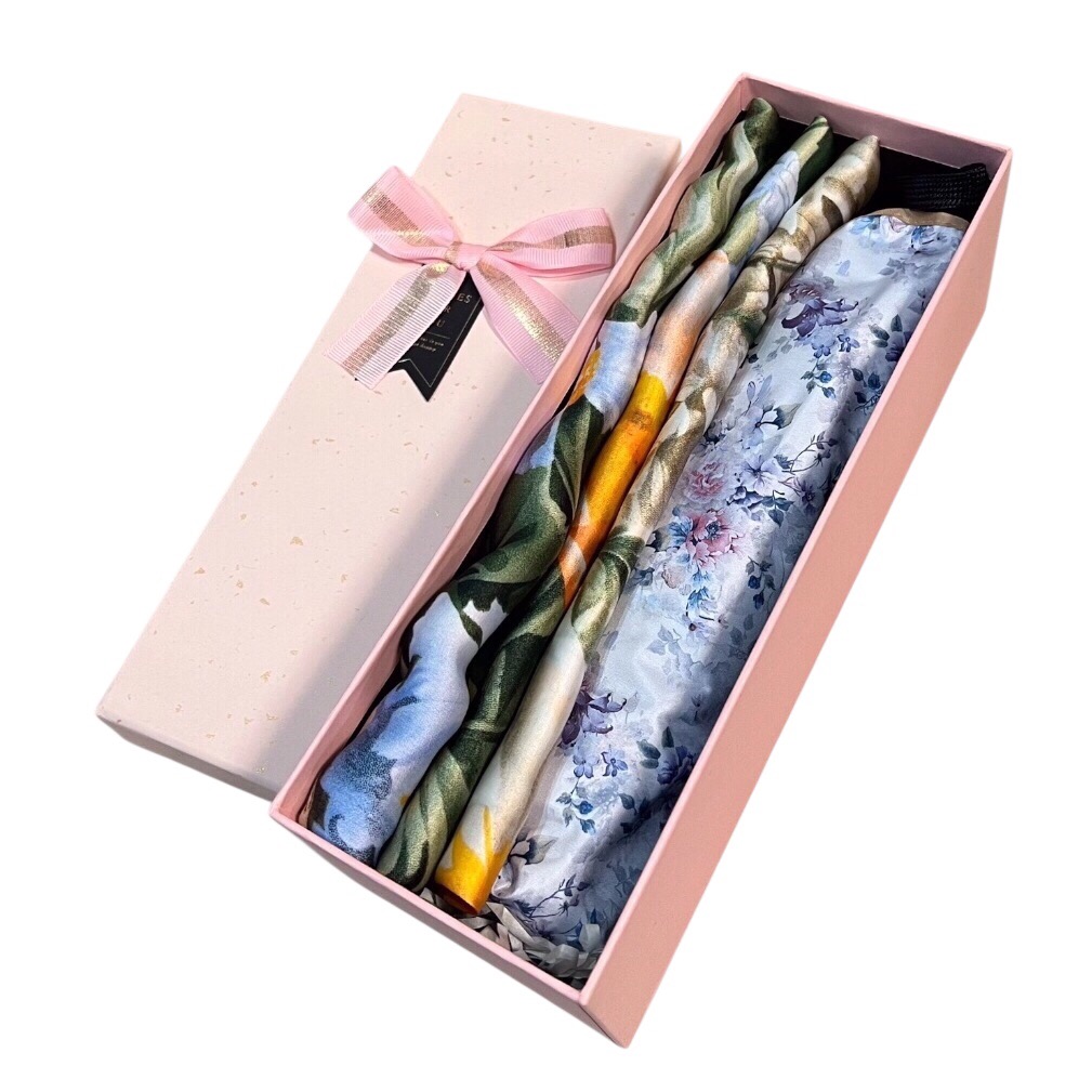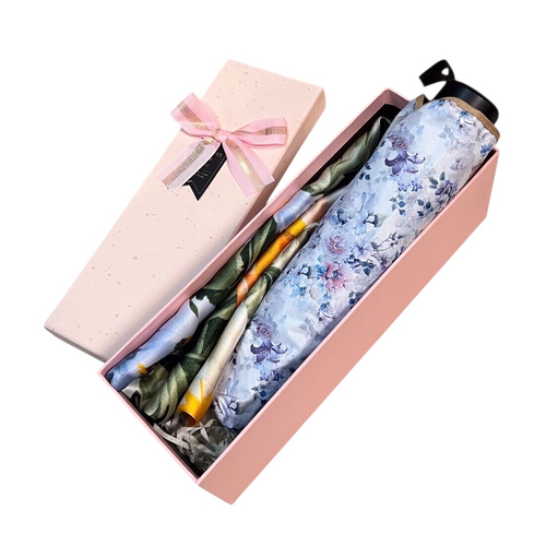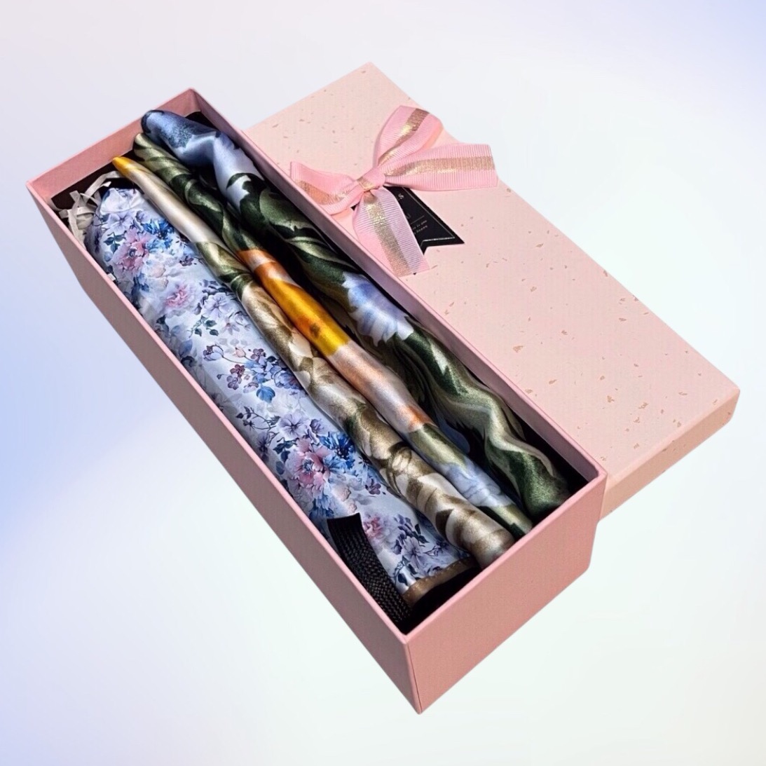 Setul conține o umbrelă pliabilă cu design floral delicat și o eșarfă fină din mătase naturală, ambalate într-o cutie premium de prezentare cu fundă decorativă, gata de oferit cadou.