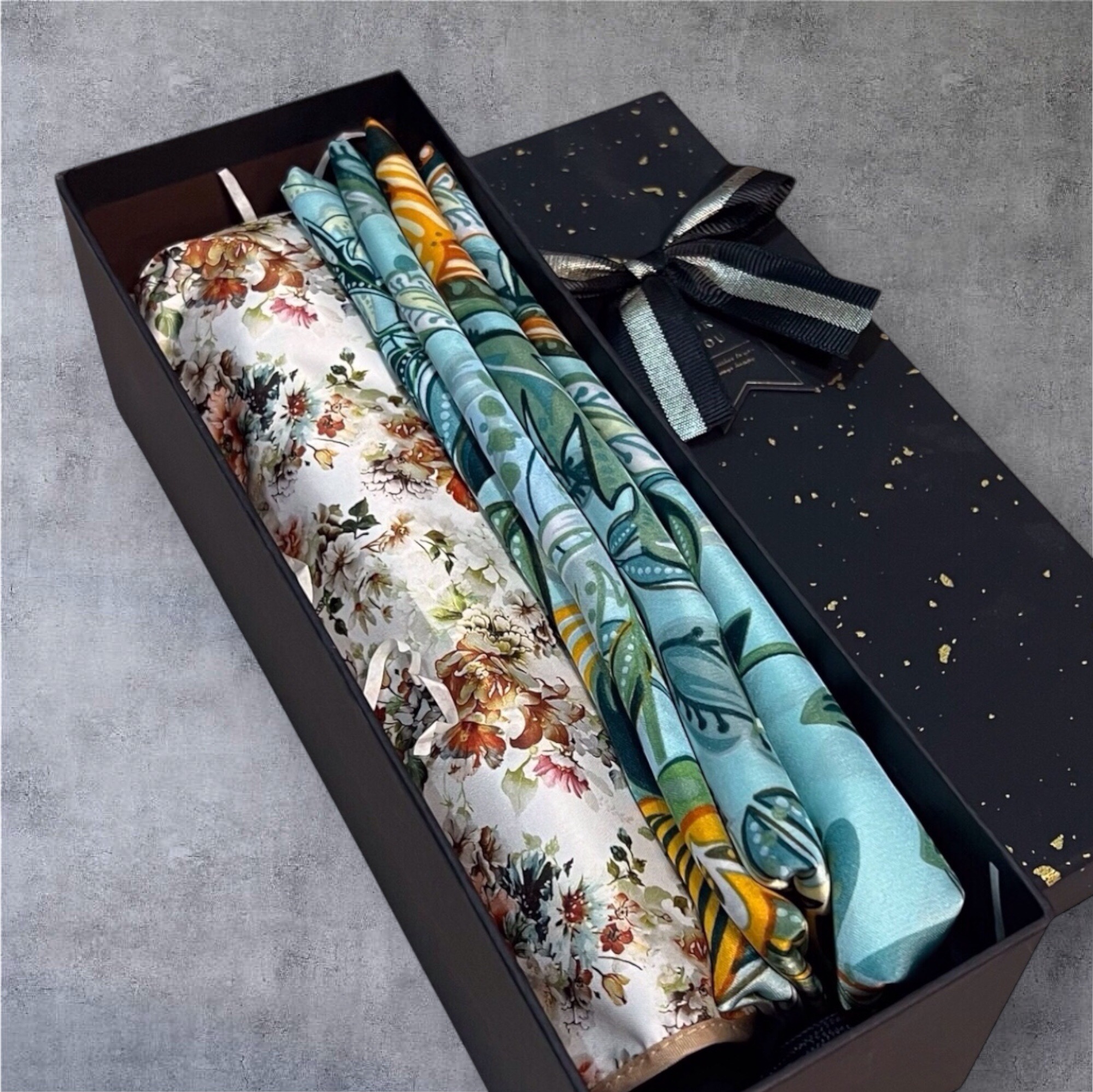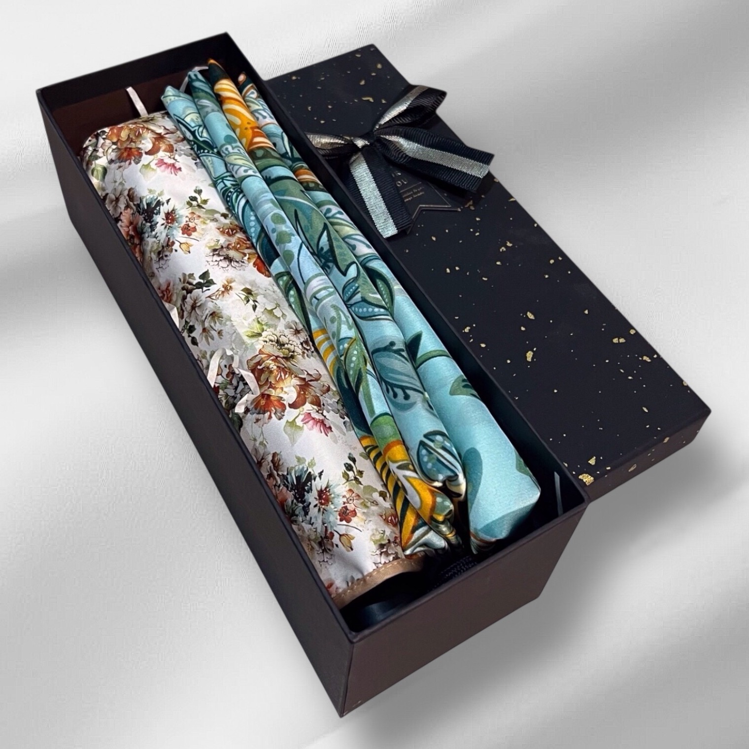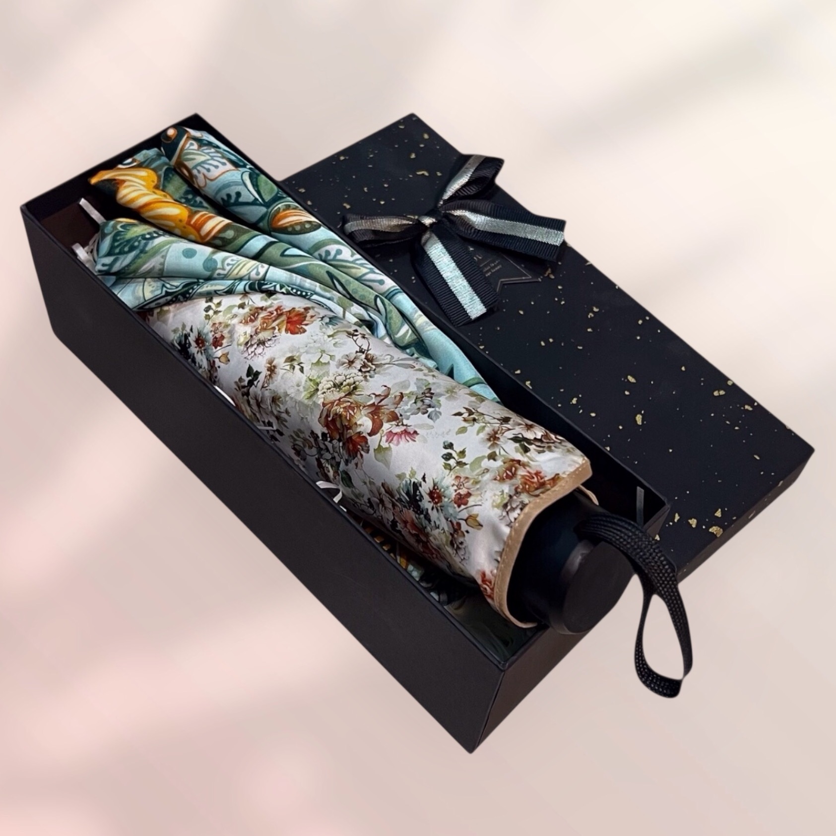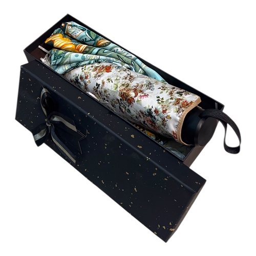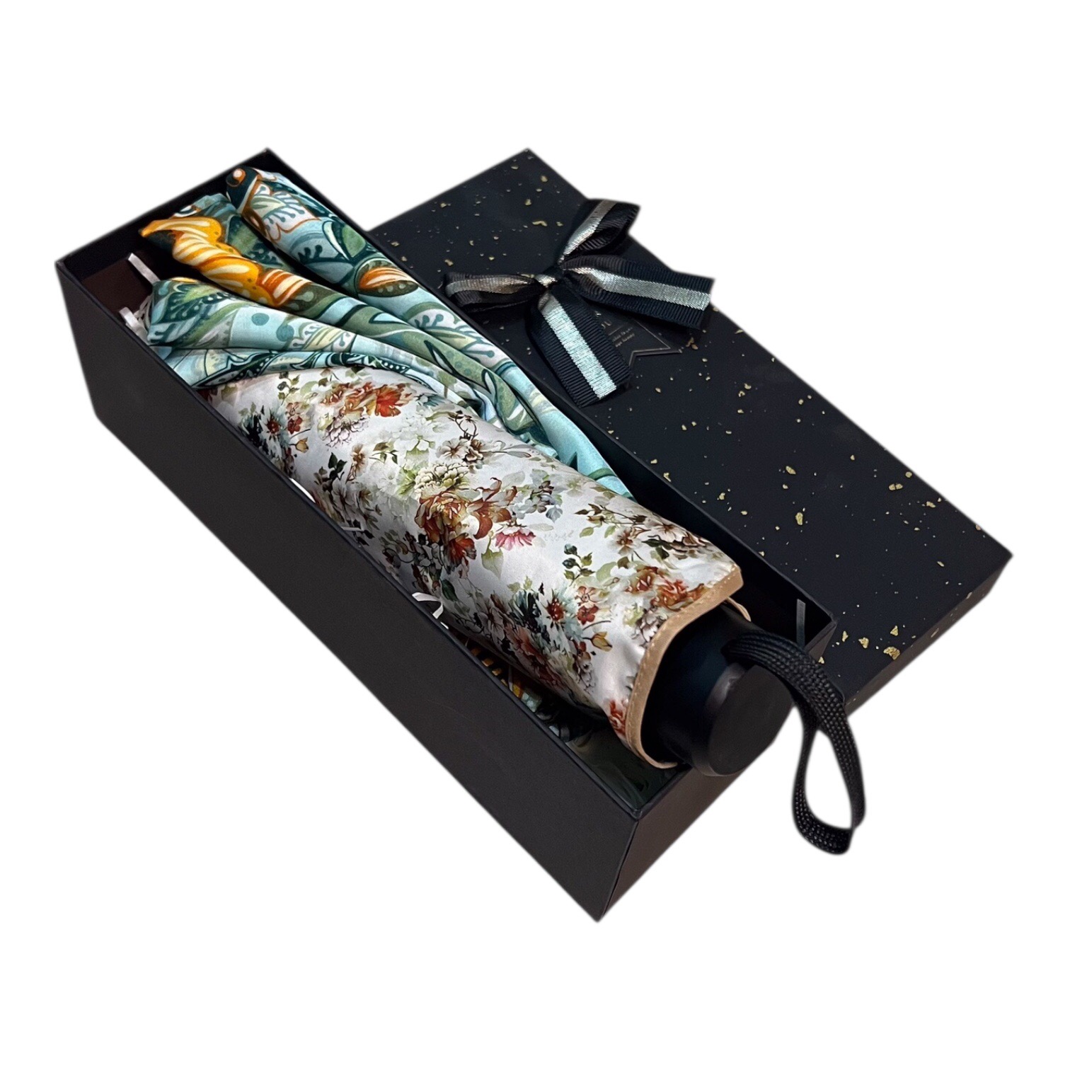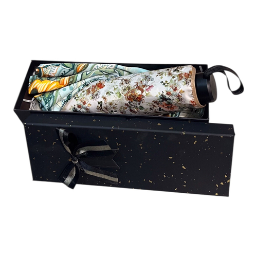 Setul contine o umbrela pliabila,vintage, practica si rezistenta, perfecta pentru orice sezon, si o esarfa din matase naturala,fina la atingere si cu un design sofisticat.