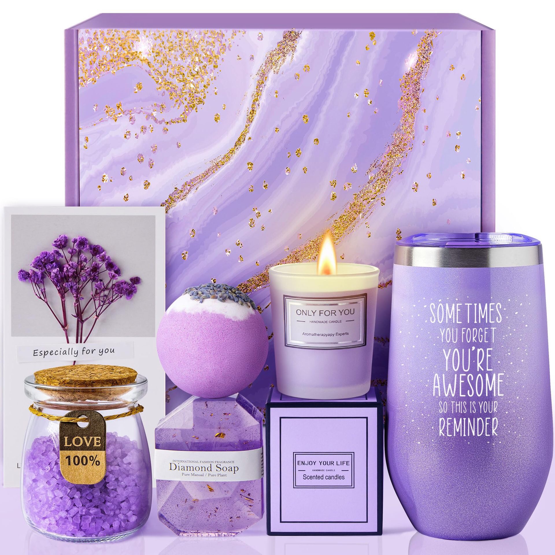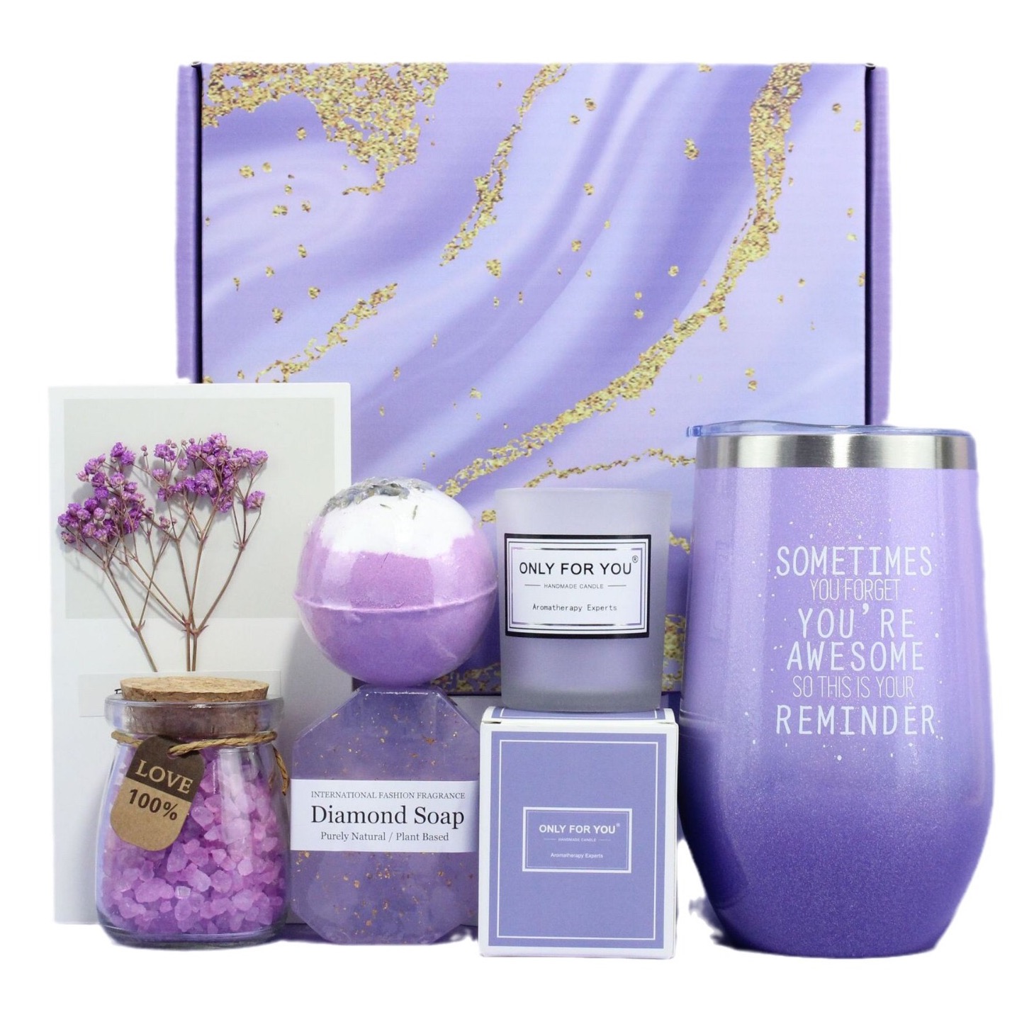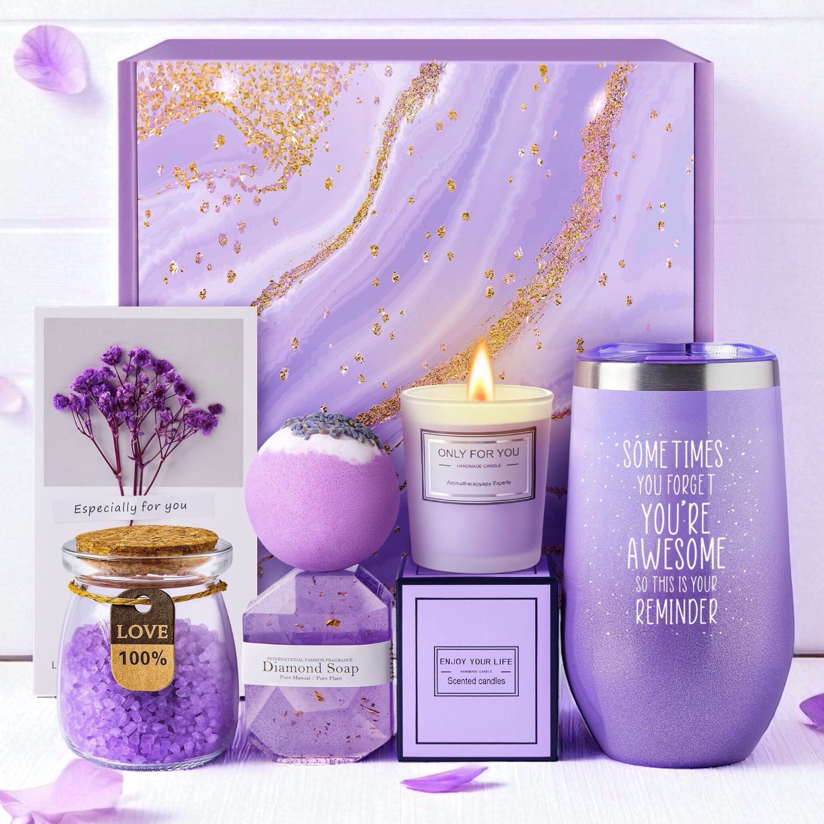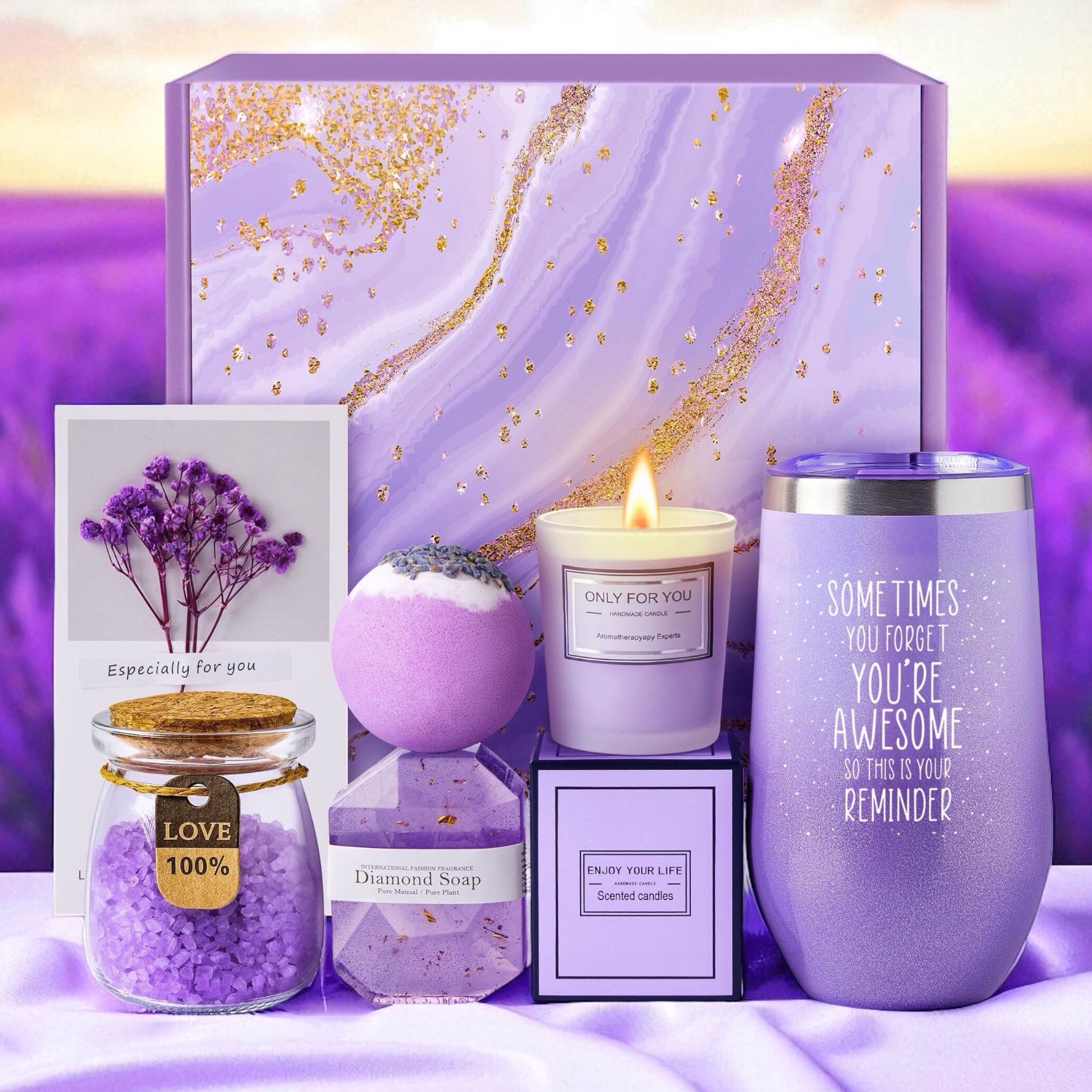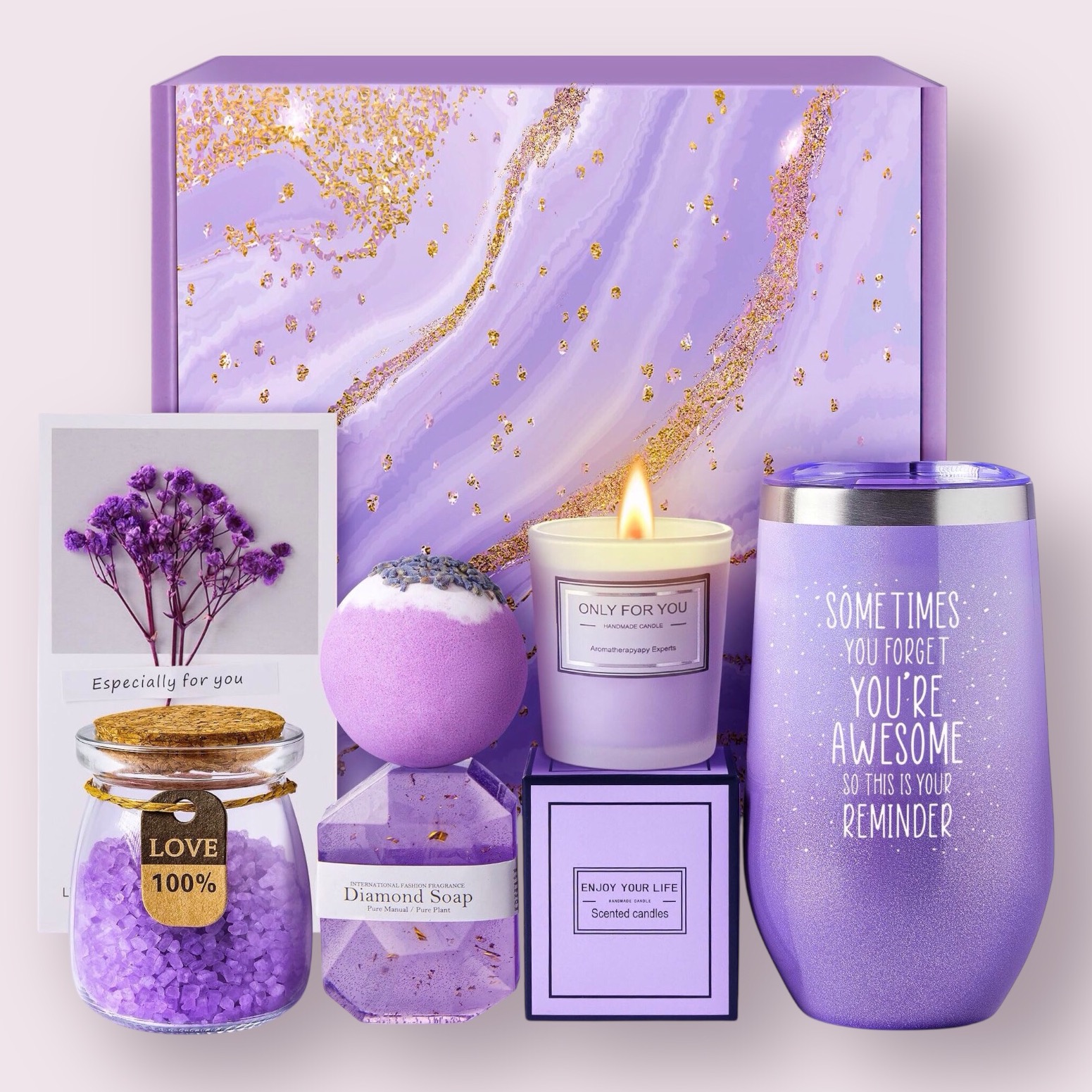 Set Cadou Just for You, Relaxare și Răsfăț – Lumânare Parfumată, Bombă de Baie, Săpun Diamond, Pahar Motivațional & Sare de Baie – Elegant în Nuanțe de Mov