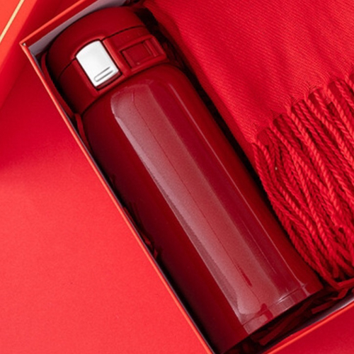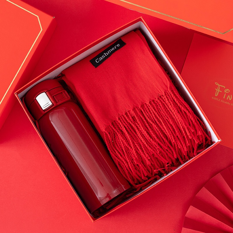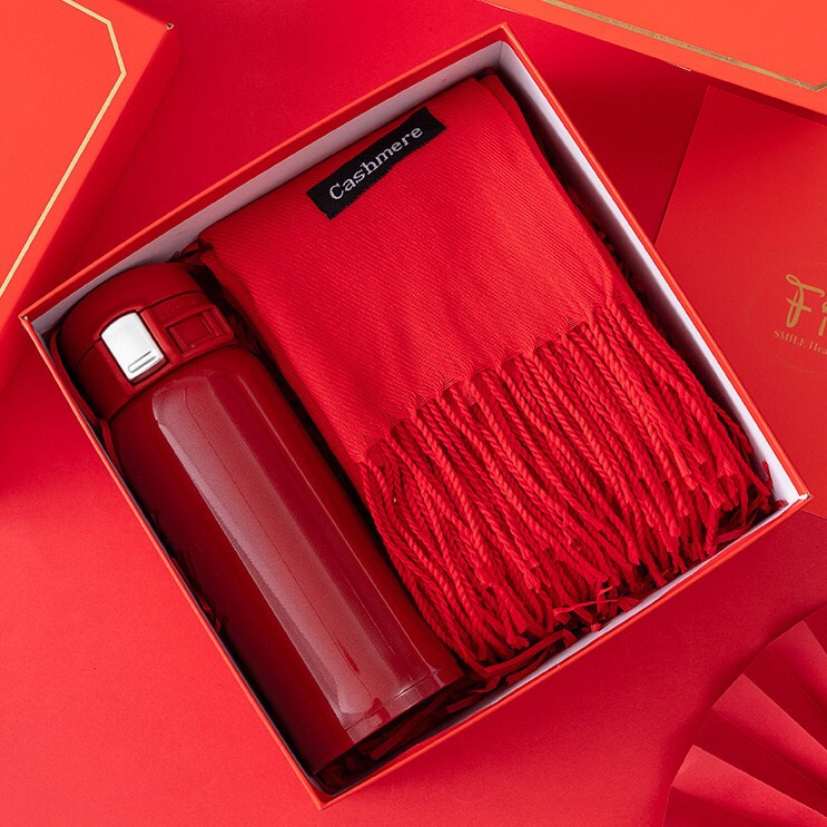 Set Cadou Premium Roșu – Eșarfă din Cașmir & Termos Elegant + Pungă Cadou