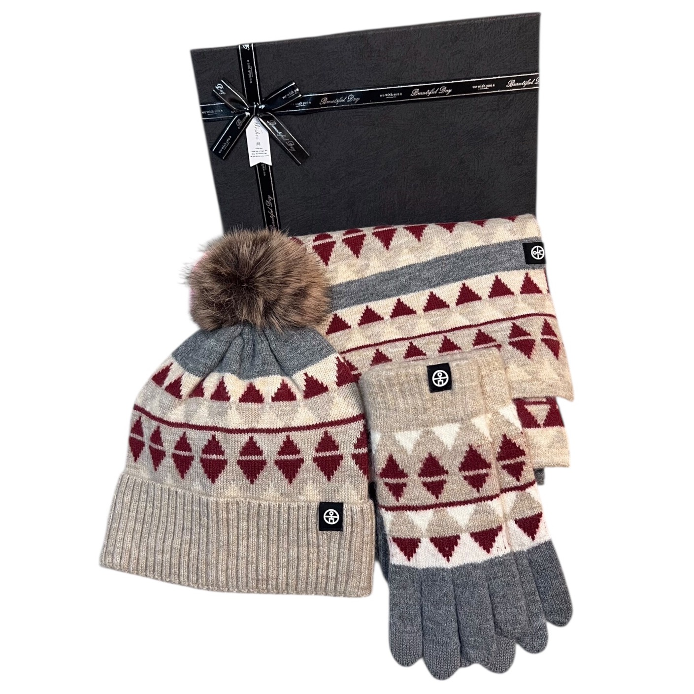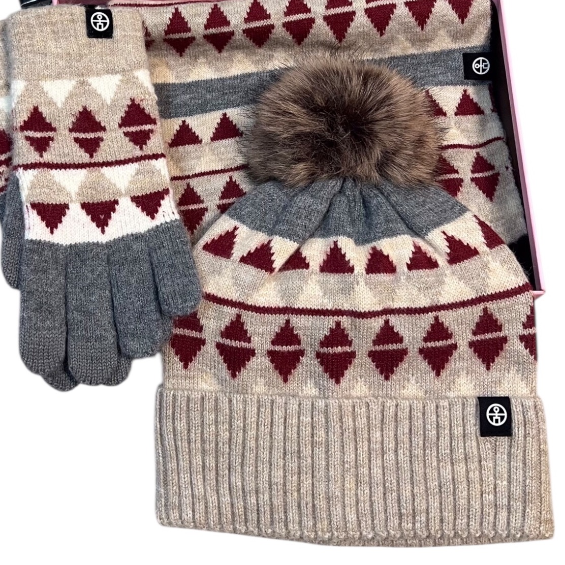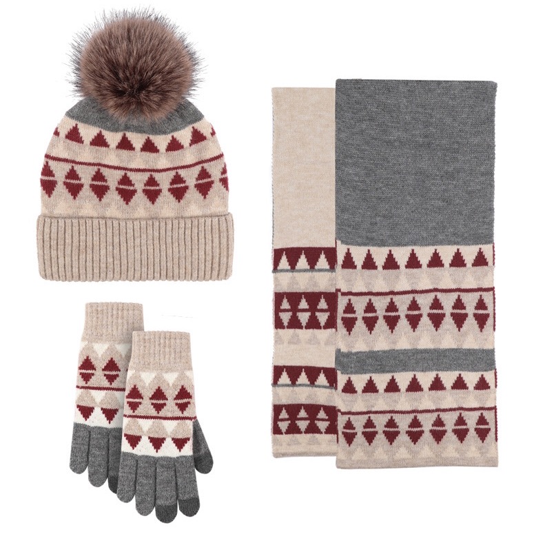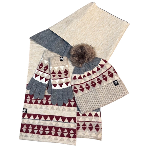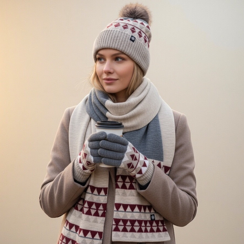 Caciula este special creată în două straturi pentru un plus de confort și căldură. Mănușile - moi și relaxante, sunt concepute cu touchscreen pentru a folosi telefonul fără a le scoate.Fularul are două fețe reversibile,în culori de bej și alta gri,decorate cu model geometric burgundy.