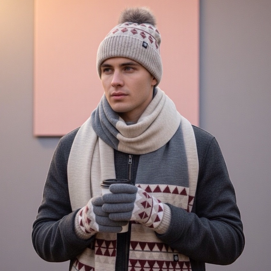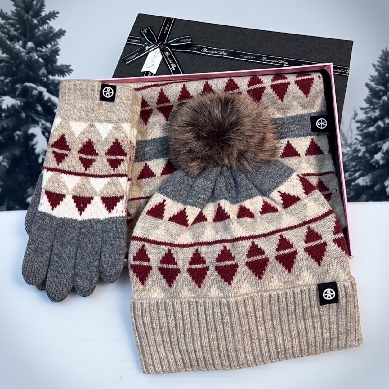 Set cadou iarnă din lână și cașmir – căciulă, fular și mănuși asortate, ambalate elegant