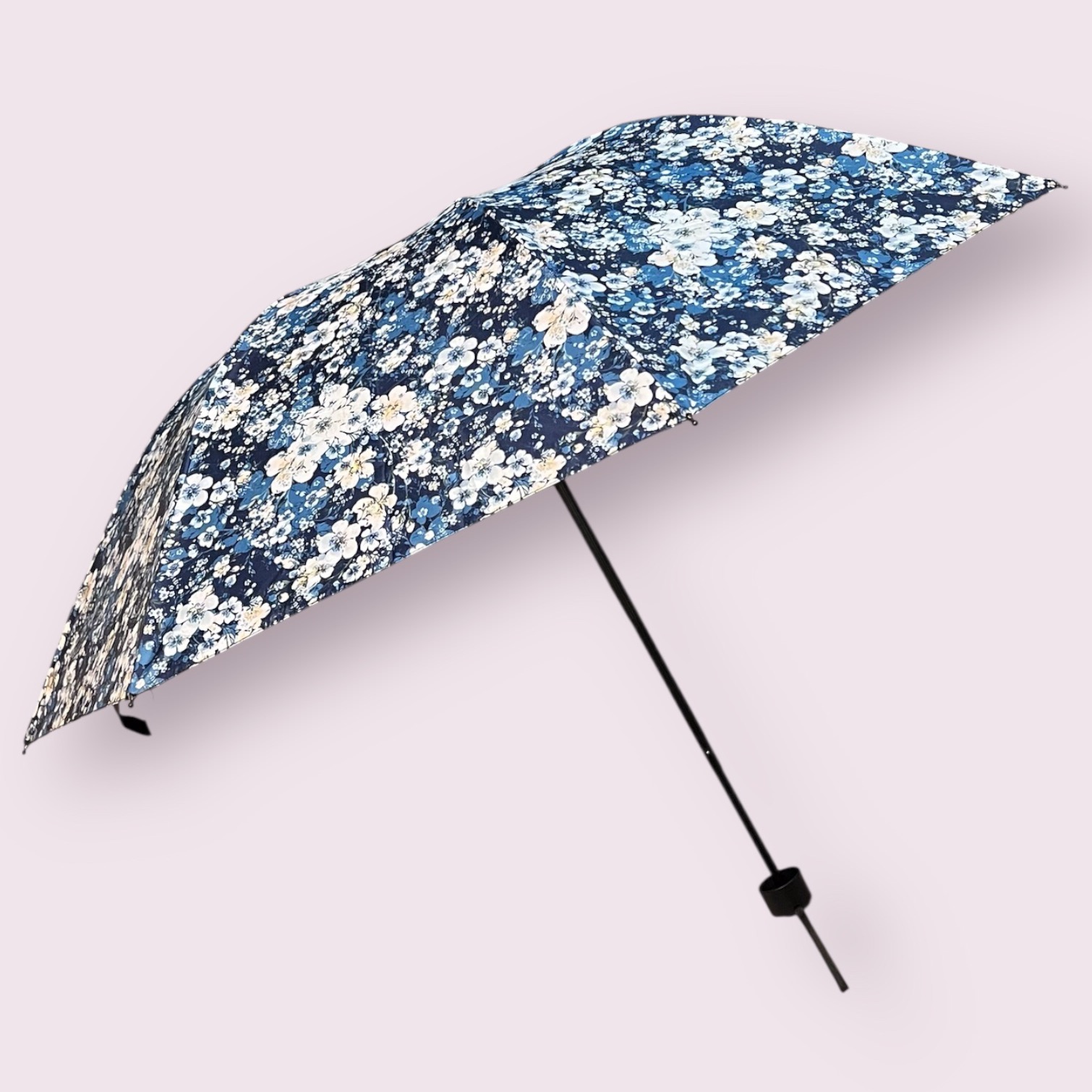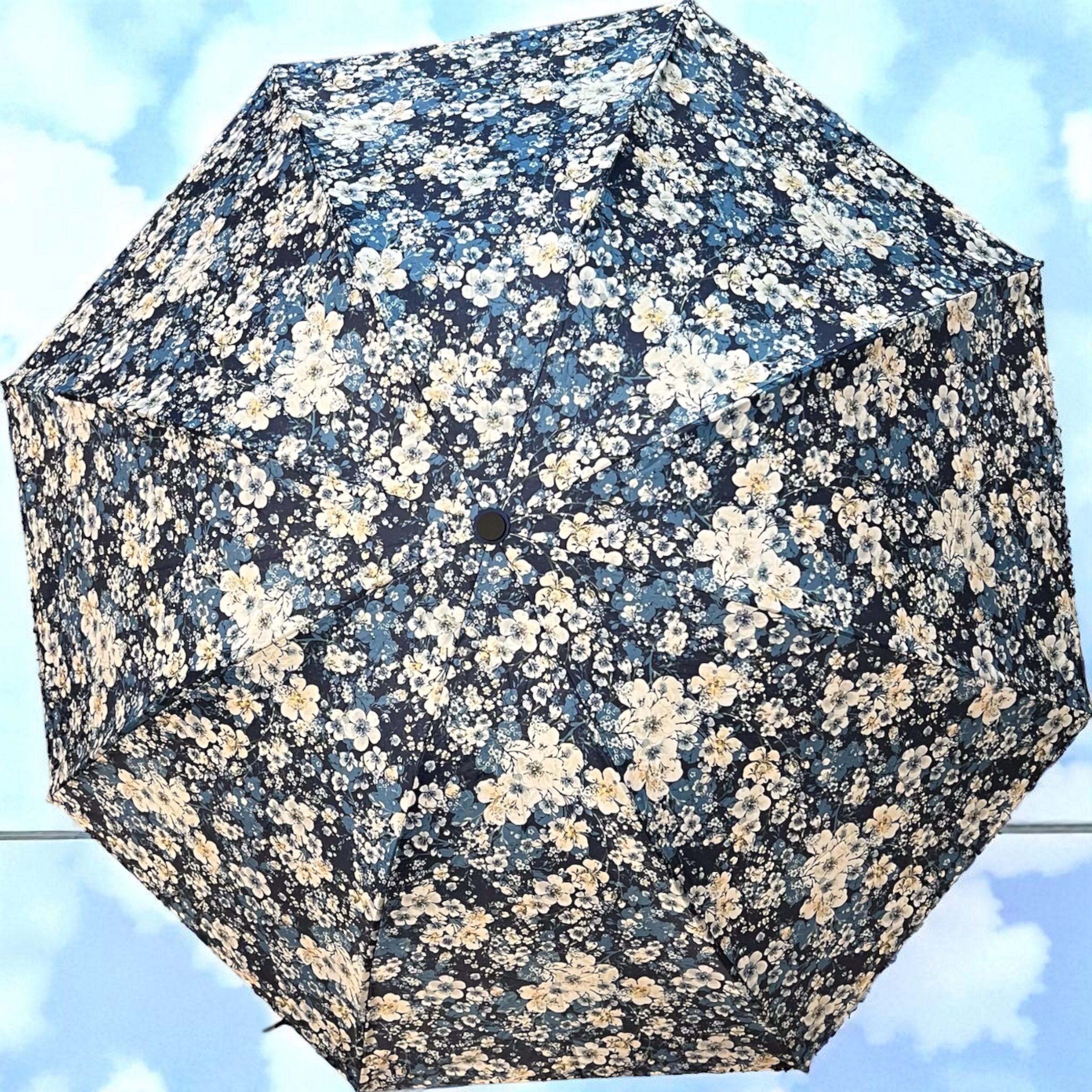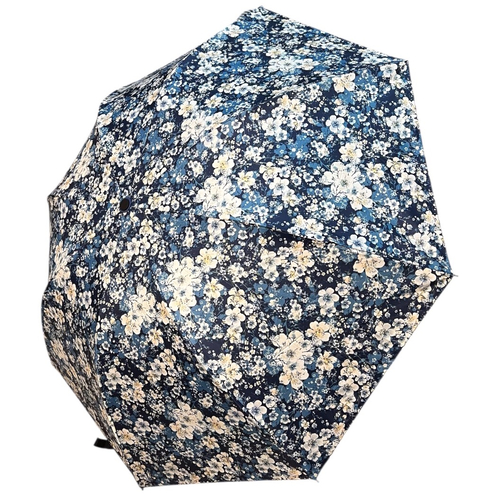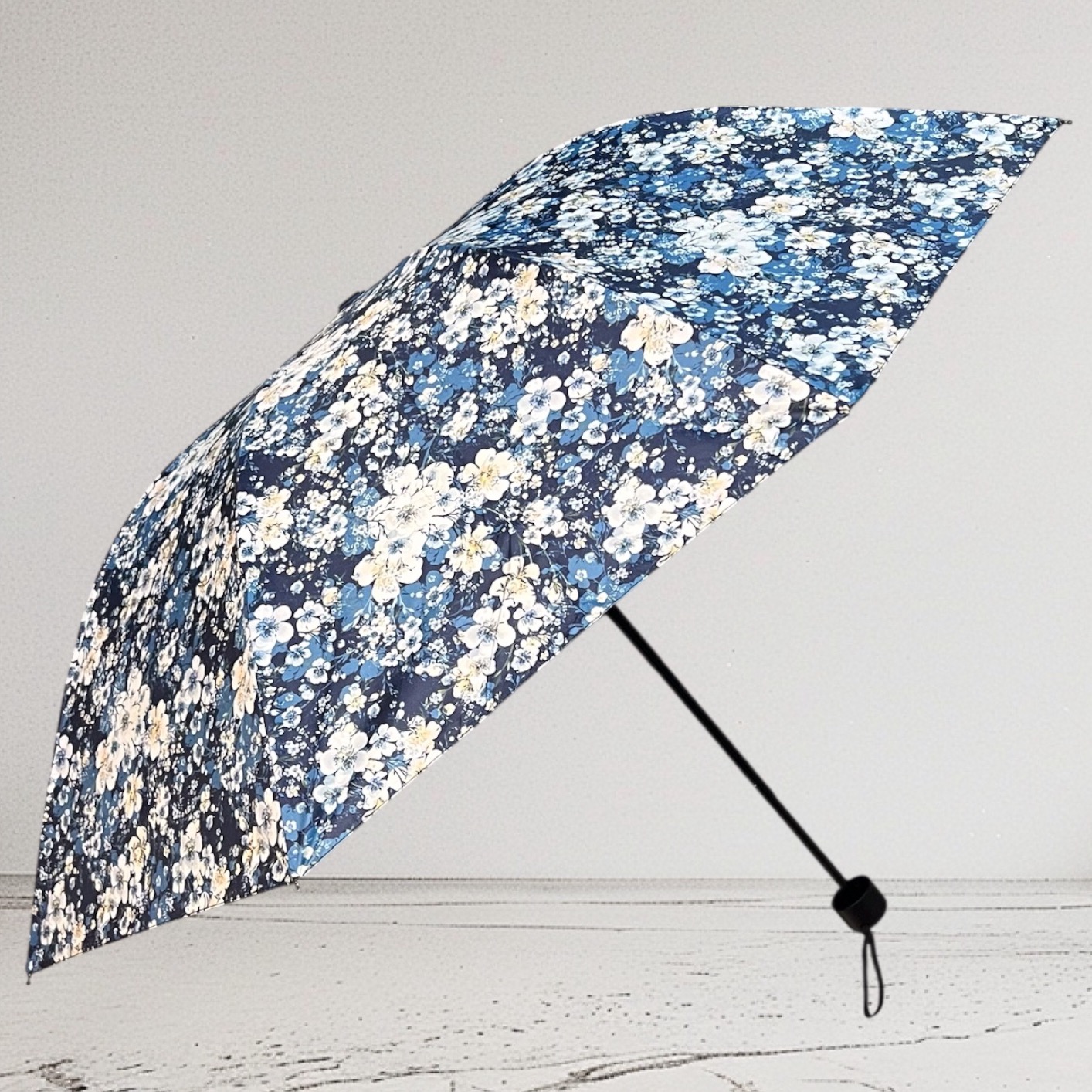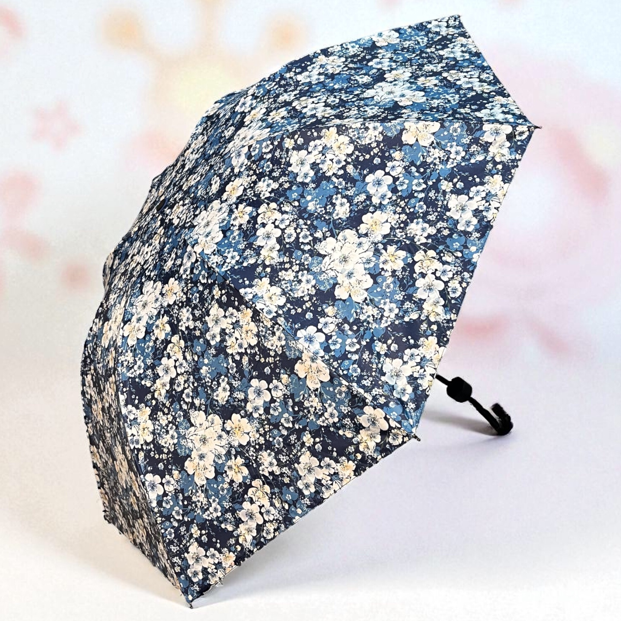 Adaugă un strop de eleganță zilelor ploioase cu această umbrelă pliabilă cu flori de măr 3D, în nuanțe de albastru și crem!