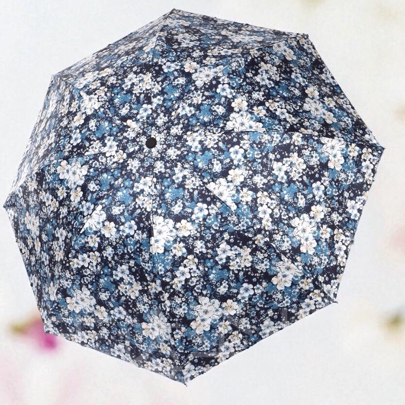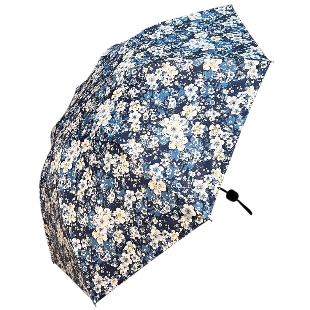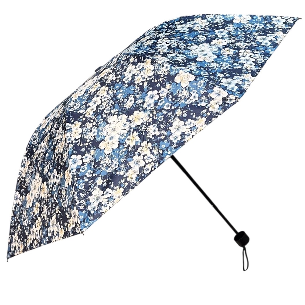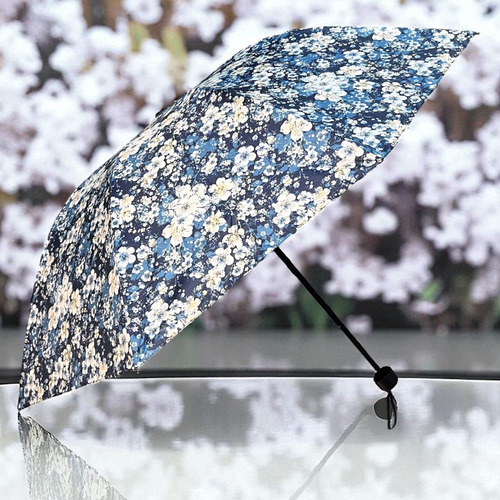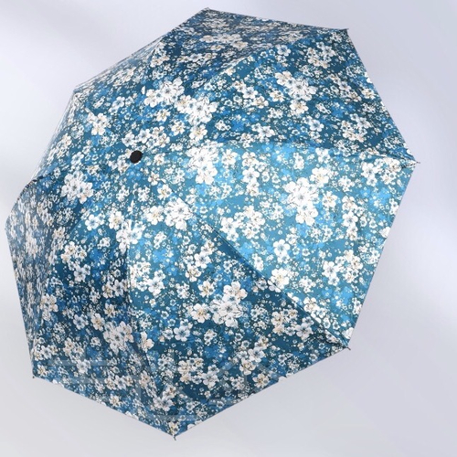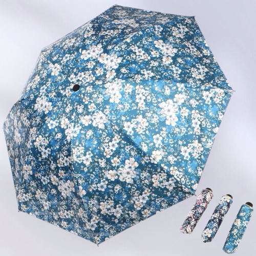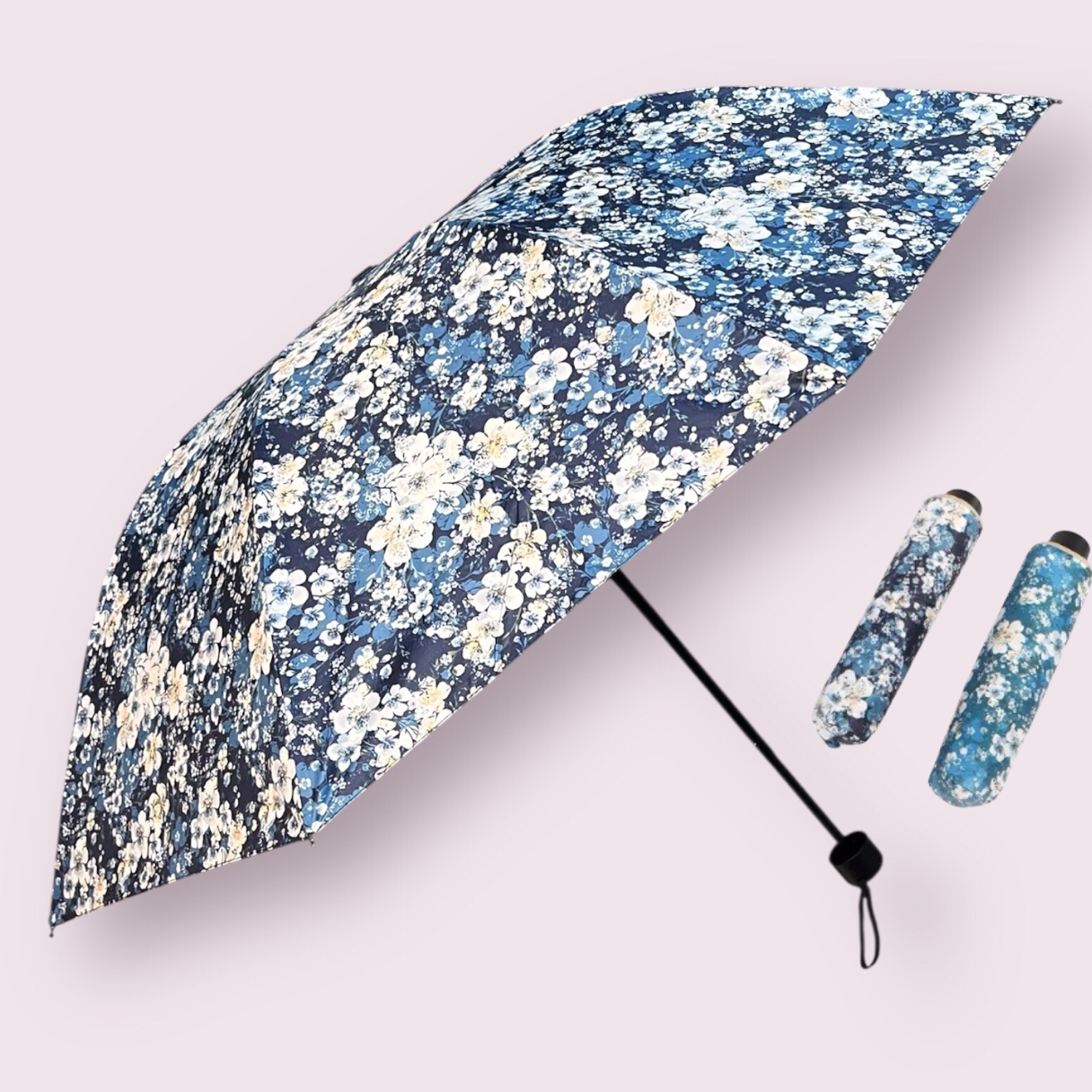 Adaugă un strop de eleganță zilelor ploioase cu această umbrelă pliabilă cu flori de măr 3D, în nuanțe de albastru și crem!