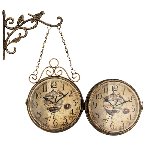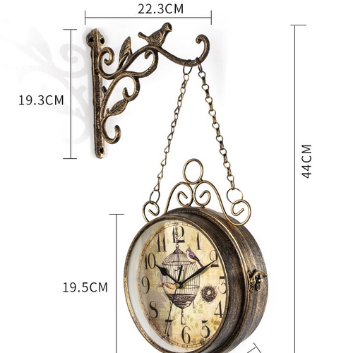 Carcasa din fier forjat alatura doua cadrane, fiecare avand propriul sau mecanism. Cele doua cadrane se rotesc la 360 grade, ceea ce va permite sa cititi ora din orice unghi. Prinderea celor doua fete ale ceasului se realizeaza cu un carlig metalic lateral.