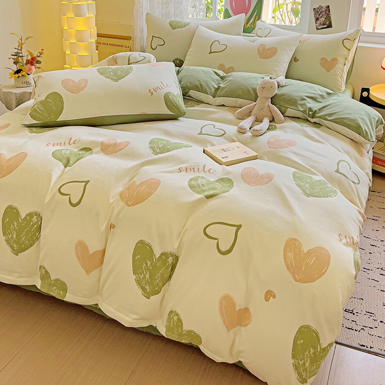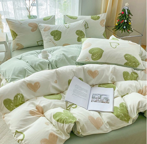 Set lenjerie de pat 4 piese din bumbac în dublu strat – un cadou elegant cu design vintage cu inimioare, verde cu bej pastel.