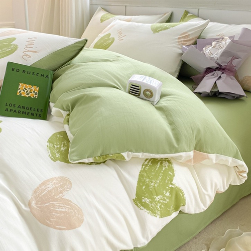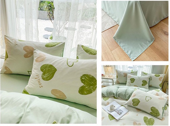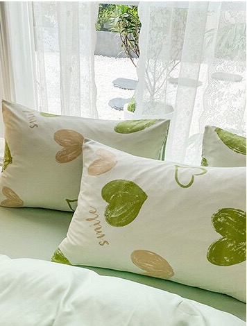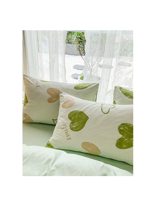 Oferă un cadou care aduce zâmbet și confort! Acest set de lenjerie de pat din bumbac natural în dublu strat îmbină finețea naturală a țesăturii cu un design jucăuș cu inimioare verde pastel.
