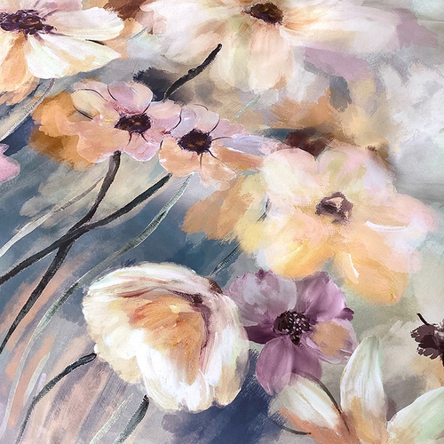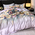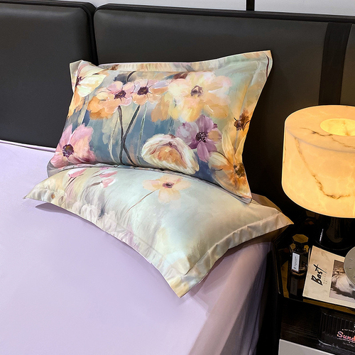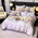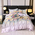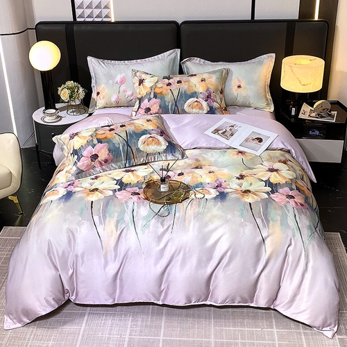 Designul floral subtil, în nuanțe rafinate de mov pal, este completat de detaliul deosebit al husei de pat cu margine amplă cu volănaș, care adaugă un plus de romantism și distincție fiecărui dormitor.