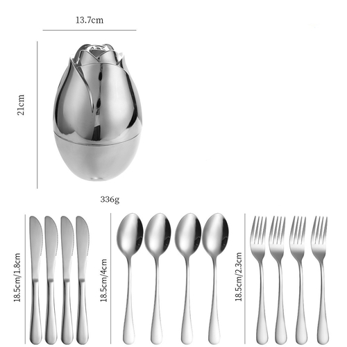 Adaugă un plus de rafinament meselor tale cu acest set de tacâmuri argintii (12 piese), însoțit de un suport decorativ deosebit în formă de trandafir.